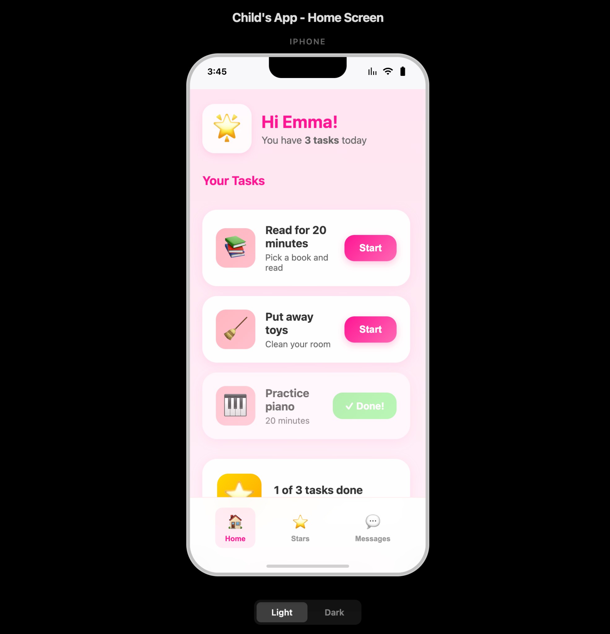 Kids don’t need complex dashboards. They need one clear screen with their tasks, big buttons, and immediate feedback.