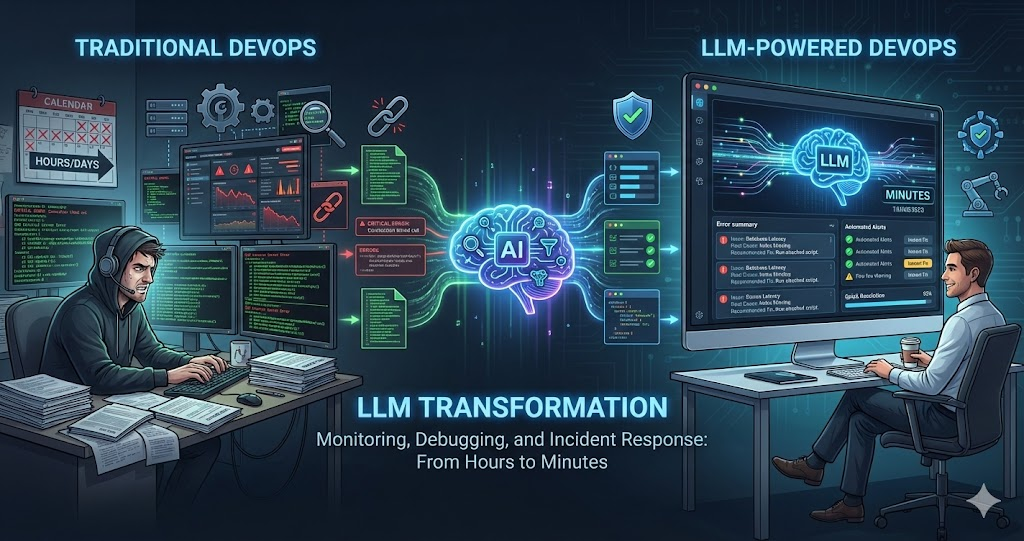 LLMs transform DevOps and production support by making operations faster, more reliable, and less stressful. They excel at analyzing logs, debugging issues, writing scripts, and responding to incidents — tasks that traditionally require deep expertise and time-consuming manual work.